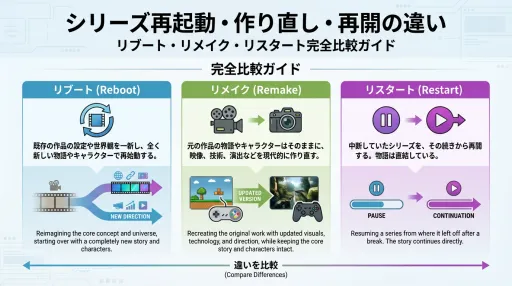という特徴があるため、リメイクやリブートとは別物として覚えておくと混乱しにくくなります。